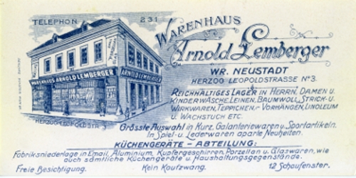 Das Warenhaus wurde ab 26. 4.1938 unter kommissarische Leitung gestellt. Am 15.6.1938 musste das Ehepaar Lemberger einen Kaufvertrag unterzeichnen, mit dem ihnen der Betrieb genommen wurde. Das Geschäft wurde im Dezember 1938 „arisiert“.