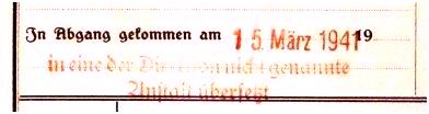 Am 7.12.1940 wurde das 10-jährige Kind in Gugging in die Landes-Pflege- und Beschäftigungsanstalt für schwachsinnige Kinder (Originalbezeichnung) aufgenommen. Für den 15.3.1941 waren die Transportlisten nach Hartheim für 14 Kinder und Jugendliche zusammengestellt und die Standesprotokolle mit dem nebenstehenden Stempel – eine Verschleierung des Zielortes Hartheim – abgeschlossen.
